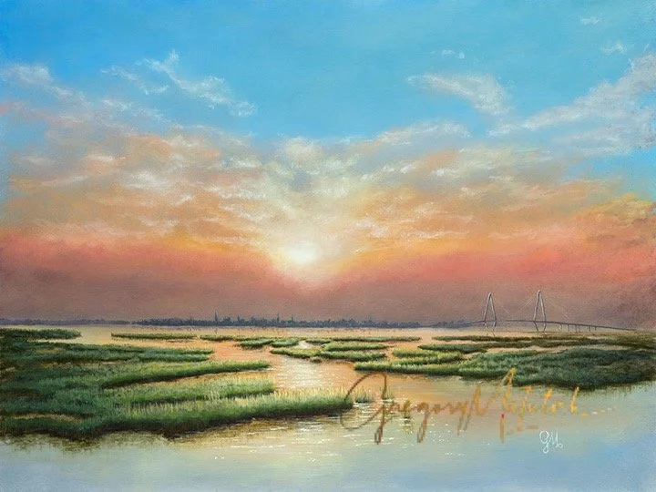 Viewing the skyline sunset from Alhambra Hall in Charleston, The Day’s End captures the evenings final moments with vibrancy extending to each and every corner.